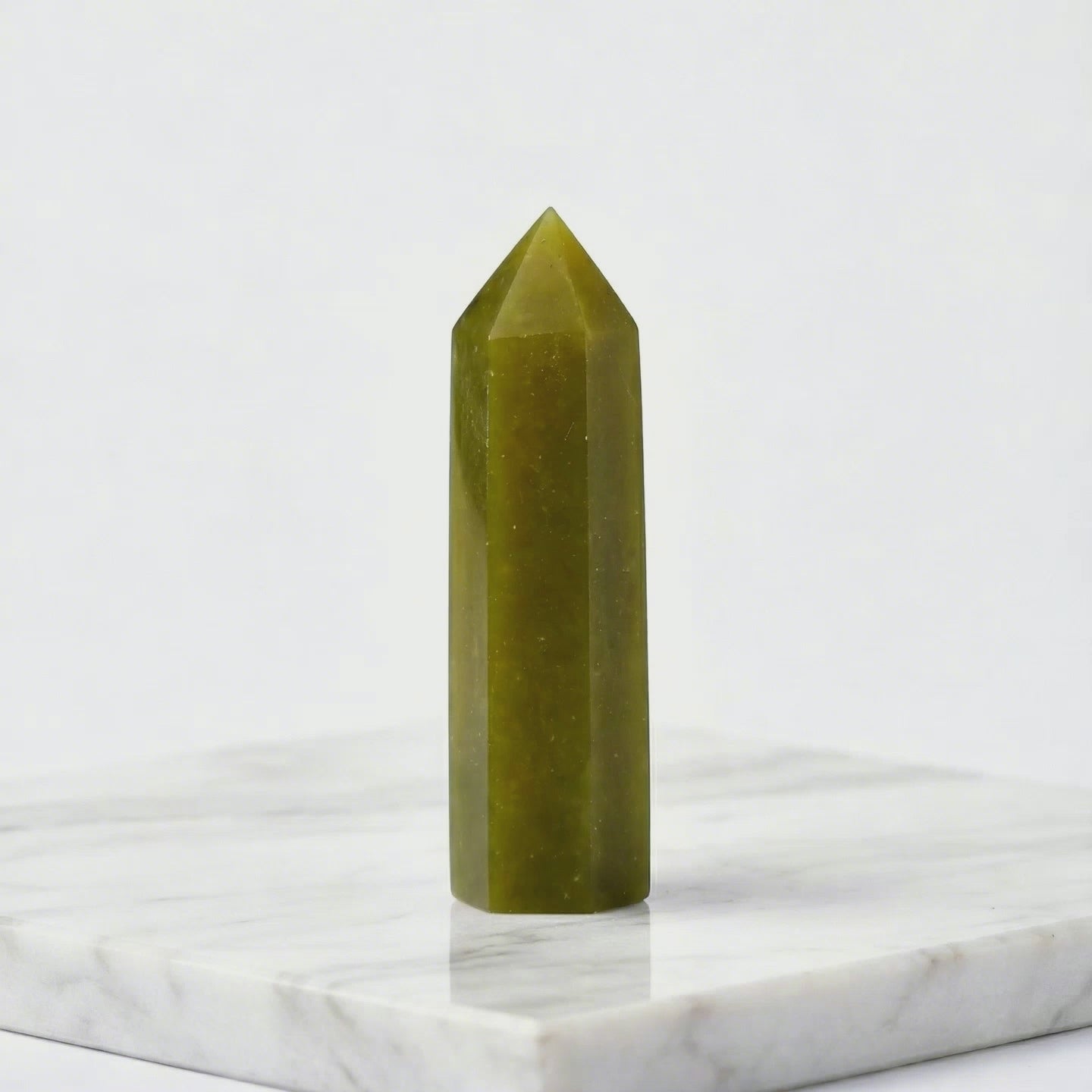 Detoxify your energy with this vibrant Olivine tower. Known to cleanse the heart of stress and heaviness, it invites joy and renewal. A refreshing anchor for a lighter spirit.